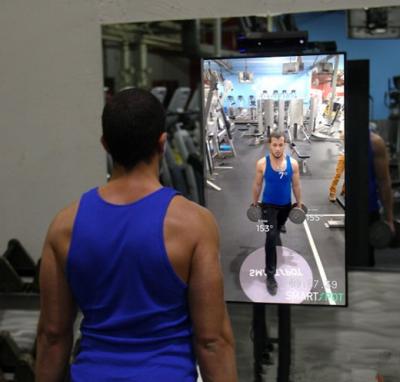 SmartSpot 健身鏡并不是一塊真正的鏡子,而是一塊顯示屏,是配合微軟的 Kinect 攝像頭進行使用,安裝在健身房之后,客戶可以在顯示器上看到自己的實時健身畫面。