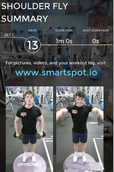 通過實時畫面,用戶可以看見自己的動作是否到位。例如,用戶在健身房SmartSpot健身鏡面前做啞鈴側平舉時,畫面中會顯示出手臂運動幅度。幅度達到要求,數字會顯示為綠色,這意味著你的手臂鍛煉到位了。