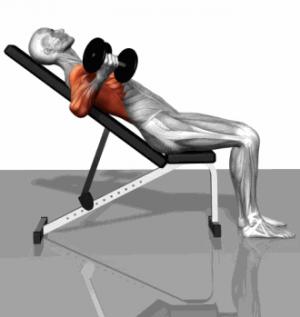 | 預(yù)備姿勢: 1、仰臥于上斜訓(xùn)練凳上,頭部枕骨、兩肩胛骨、胸椎、骶尾骨緊貼凳面,腰部留有一掌厚度的空隙。 2、臀部坐在凳面上,雙腿分開,屈膝90度,雙腳踏托桿。 3、雙手分開一個半肩寬,肘關(guān)節(jié)微屈,于胸部正上方持啞鈴。 4、目視前上方,調(diào)整呼吸,準備。 |