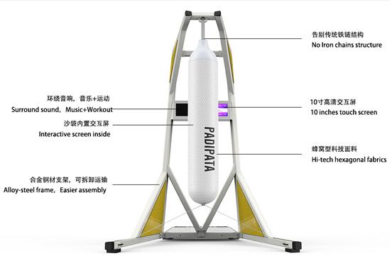 PADIPATA 智能交互沙袋不僅僅是沙袋,同時也是一款體育娛樂設備,通過內置的游戲可與其他用戶在線交互、PK、積分排名等。包括闖關模式、挑戰模式、娛樂模式等,在不知不覺中達到訓練效果。同時內置課程,用戶可針對性進行搏擊訓練,并在教練的指導下完成相應課程。